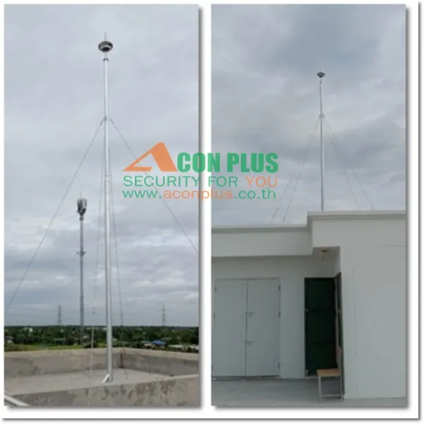 หัวล่อฟ้า LIVA  ตั้งอยู่บนเสาสูง 6 เมตร ดึงสลิงหุ้ม PVC  ป้องกันการเกิดสนิม และยืดอายุการใช้งาน